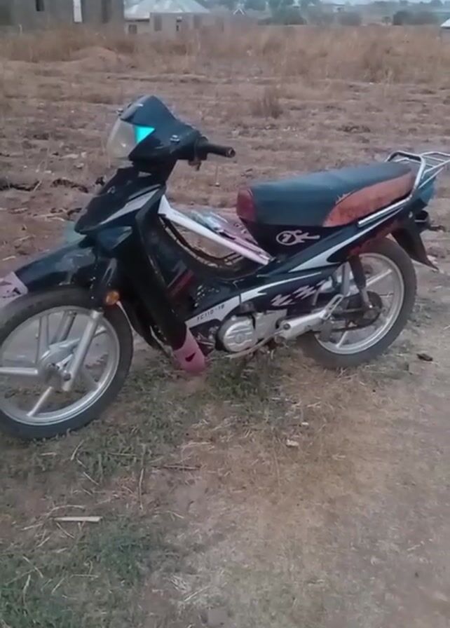The video presents a stationary, black motorcycle, possibly a scooter or underbone type, parked on a dirt surface. The background consists of dry grass and sparse vegetation with a few unfinished or abandoned building structures visible in the distance. The motorcycle has silver-colored wheels, a dark seat, and pink accents on its lower body. The sky appears overcast or the video may have been taken during dusk.