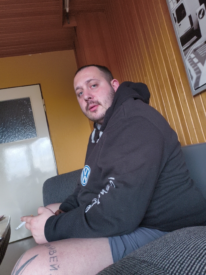 In an interior setting, identified as Ludwigshafen am Rhein, Germany, a male individual is seated on a grey upholstered sofa or bench. The subject, with light skin, short dark hair, and facial stubble, is looking directly at the camera with a neutral expression. He is wearing a black hooded sweatshirt with a blue and white Volkswagen logo on the left chest and partially visible white text on the right sleeve. Grey shorts are visible, exposing his right thigh, which features two tattoos: a large dark design and Cyrillic script, partially legible as "ИВЕЙ." He holds a lit cigarette between the index and middle fingers of his right hand. The background includes walls primarily covered in vertical wooden paneling, alongside a section of a plain yellow wall. A cream-colored door with a textured glass panel is situated on the yellow wall. The ceiling is constructed from matching wooden panels, with white piping visible in the upper left. A framed black and white image, depicting what appears to be a white van, is mounted on the wooden-paneled wall to the right. A reflective surface of a table is partially visible to the left of the subject.