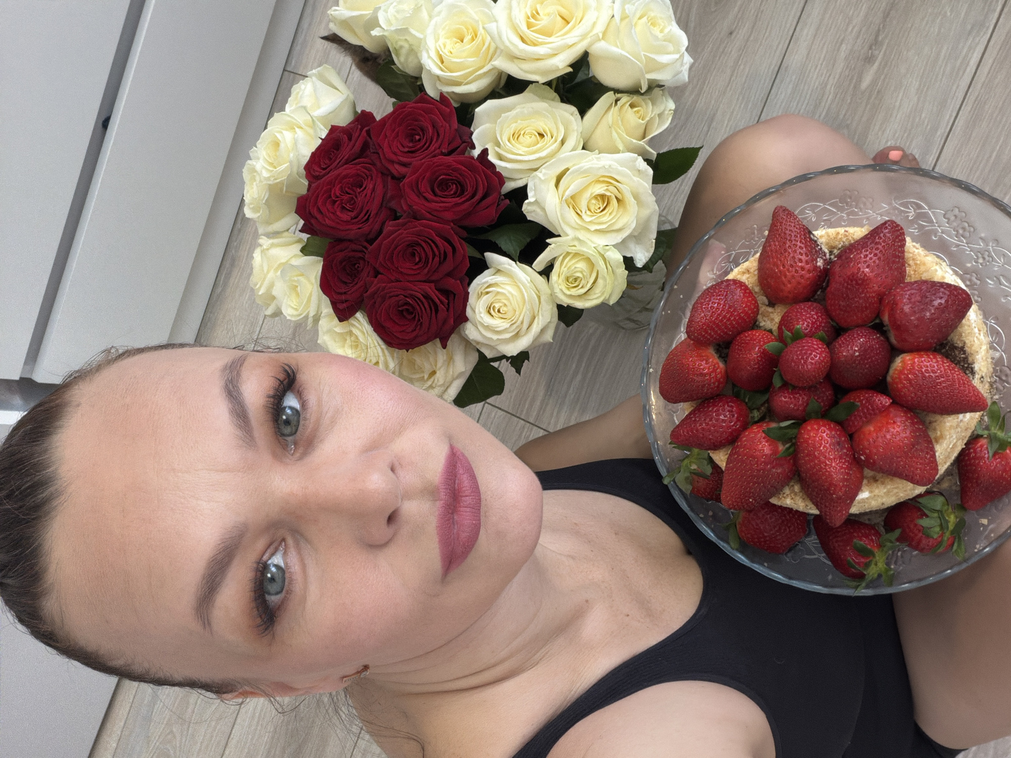 A woman is sitting on a light-colored wooden floor, holding a glass dish filled with a cake covered with strawberries in her right hand, and a bouquet of red and white roses to her left. The woman is wearing a black tank top. The location is implied to be in the city of Chaikovsky, Russia.