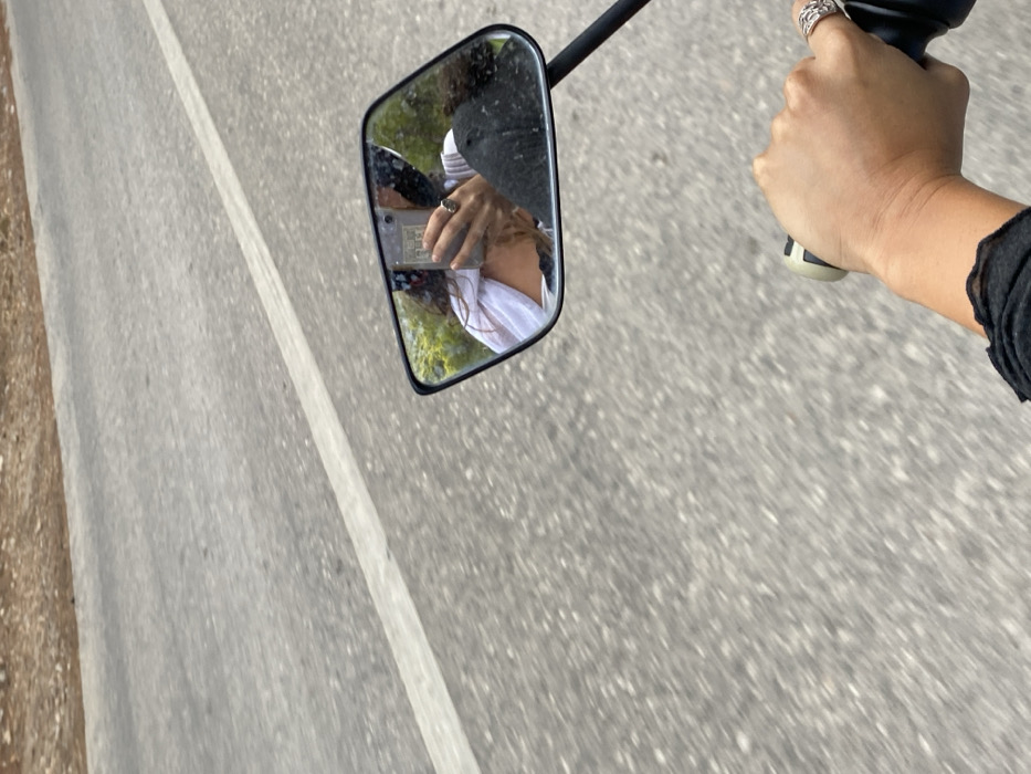 The image presents a first-person perspective from a moving vehicle, likely a scooter or motorcycle, on a paved road in Aegina, Greece. In the bottom right foreground, a hand with light skin, wearing a silver-toned, intricately designed ring on the fourth finger, grips a black and light-colored handlebar. The cuff of a black, ruffled sleeve is visible on the wrist. A black rectangular rearview mirror dominates the mid-right portion of the frame. The mirror's reflection captures a person, identified as the driver, holding a grey smartphone to take the photograph. This person exhibits long, dark, curly hair, wears a white garment over a darker top, and has a partially visible black helmet. A ring is also visible on a finger of the hand holding the phone. Lush green foliage is reflected behind the person. The environment consists of a grey asphalt road with a faded white lane line, indicating forward motion. A sparse, dry embankment is visible along the left side of the road.