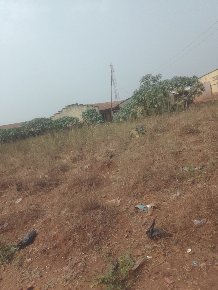 The image displays an outdoor scene in the city of Unknown, Unknown, under a pale grey, overcast sky. The immediate foreground and midground consist of a reddish-brown earthen slope sparsely covered with dry, light-brown herbaceous vegetation. Numerous pieces of discarded debris, including plastic fragments (blue, white, black), are visible scattered across the ground. In the background, at the crest of the slope, are multiple structures. A light-colored building with a reddish-brown roof features a distinctive stepped parapet along its left section. To its right, partially obscured by dense, tall green vegetation, is another structure with a similar reddish-brown roof. A tall, slender, freestanding metal lattice tower is positioned between these buildings, rising against the sky. Faint utility lines traverse the sky in the upper background. No human or animal subjects are present, and no active interactions are depicted.
