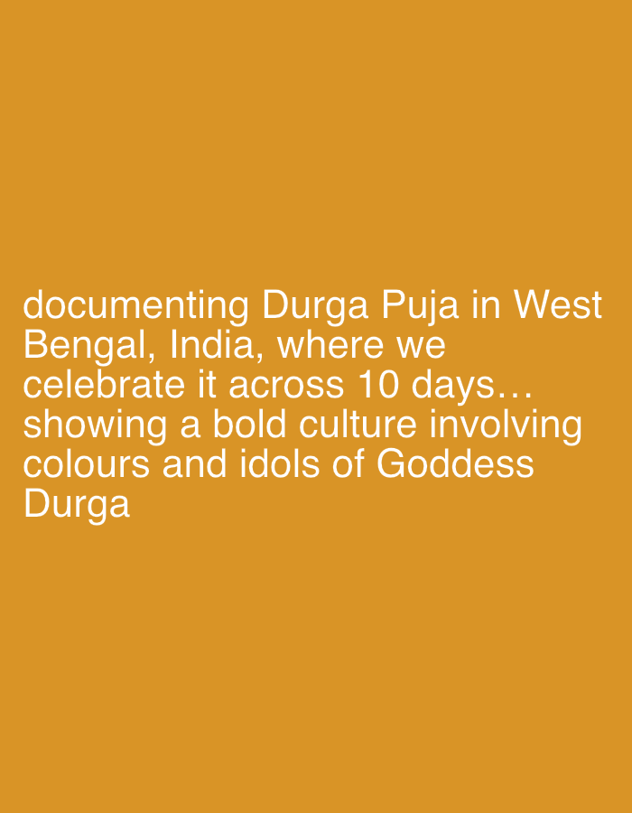 The image displays white sans-serif text overlaid on a solid dark orange background. The text occupies the lower portion of the frame and reads: "documenting Durga Puja in West Bengal, India, where we celebrate it across 10 days... showing a bold culture involving colours and idols of Goddess Durga". The text describes a cultural celebration of Durga Puja, which takes place in West Bengal, India, specifically within the city of Bidhannagar. There are no other discernible subjects, objects, people, actions, or environmental details present.