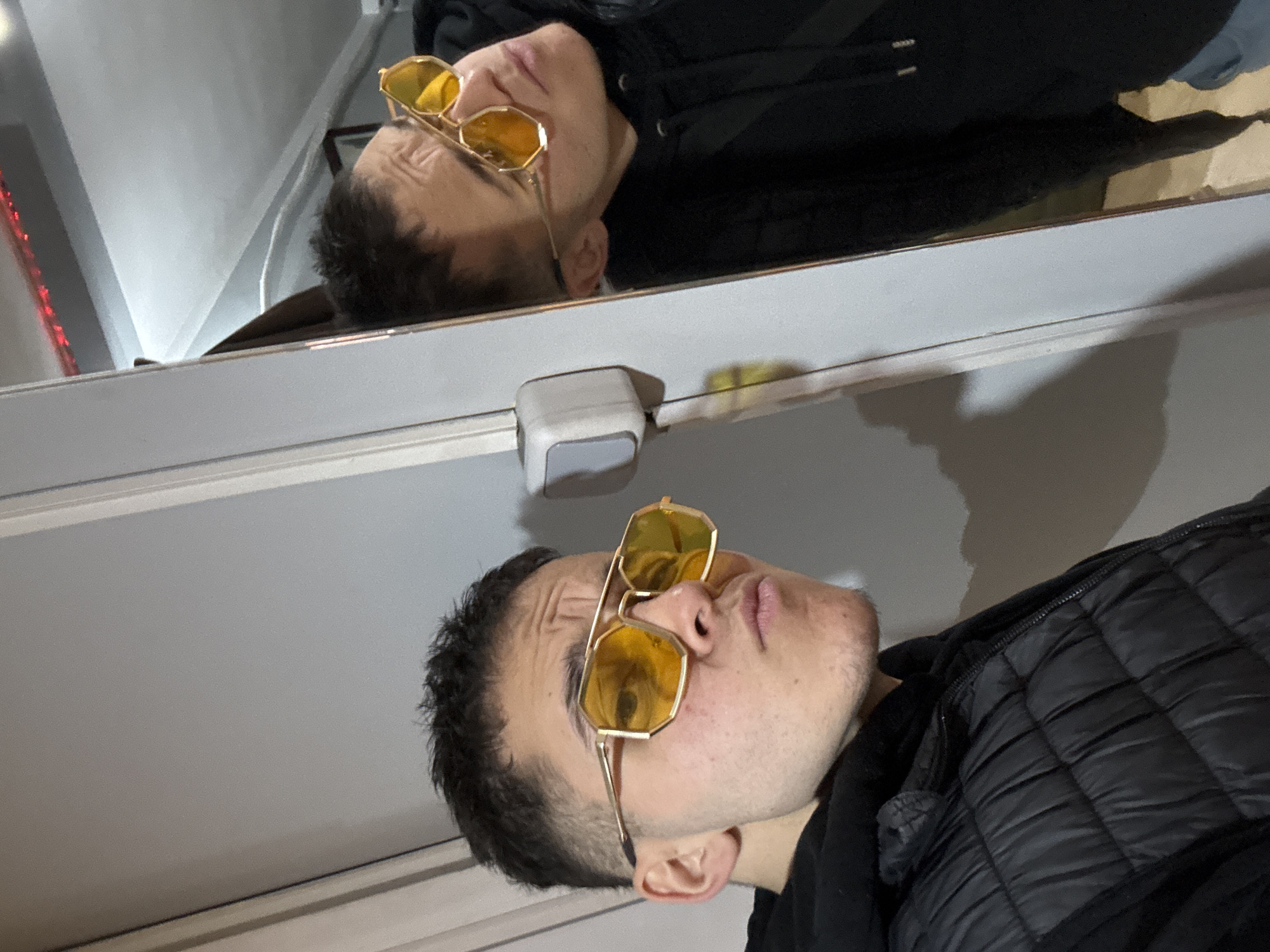 A man is pictured wearing gold-framed sunglasses, a black quilted jacket, and a black hooded sweatshirt. He is looking up towards a mirror and is reflected in it. A dispenser is mounted on the wall beneath the mirror. The background appears to be a light gray wall. The location information is not discernible from the visual data.