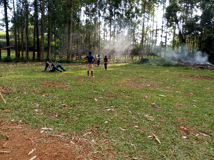 The scene depicts an outdoor environment identified as Borabu Chitago ward, Kenya. The foreground and mid-ground consist of a grassy field interspersed with patches of reddish-brown dirt. Scattered colorful debris, including blue, red, and yellow fragments, is visible on the ground. A dense stand of tall, slender trees with light-colored trunks forms the background, suggesting a forest edge. Sunlight streams through the trees from the rear, casting highlights and shadows. Five individuals are present. In the mid-ground, to the left of center, a male subject is seated on the grass, leaning back with his left hand on the ground. He wears a dark patterned long-sleeved shirt and blue jeans, with his legs extended. Centered in the mid-ground, another male subject stands facing away from the camera, hands on his hips, wearing a dark blue t-shirt and light-colored shorts. Further back, closer to the tree line on the right, three additional individuals are visible. One figure wears a blue shirt, another a lighter top, and a third is partially obscured. Their specific actions are indistinct. Two distinct plumes of white smoke rise from the right side of the image near the tree line, indicating active burning or smoldering piles of material. A light-colored, elongated object, possibly wood, extends into the frame from the lower left, partially cropped. No direct interaction between the subjects is observable.