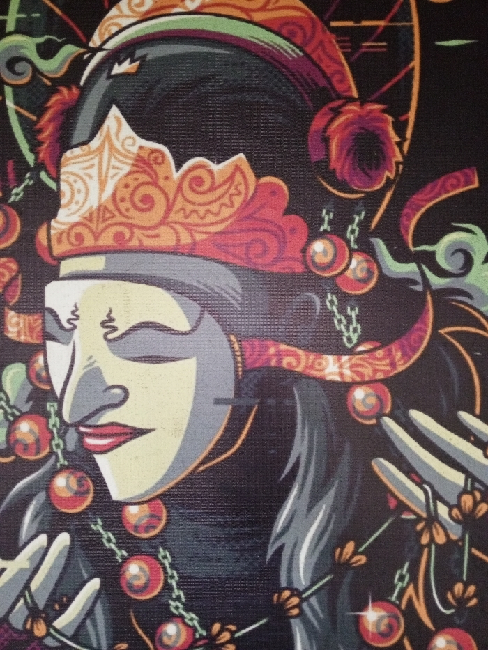 The image displays a stylized artwork, not a scene in the city of Voa Yeav, Cambodia. The artwork features an anthropomorphic figure presented in a profile view, from the upper chest upward, against a dark background with subtle abstract patterns. **Subject:** A character, possibly a deity or revered figure, depicted with a pale yellow-cream face, closed eyes marked by three wavy lines on each eyelid, a prominent aquiline nose, and small, red lips. The expression is serene. **Headwear and Hair:** The figure wears an ornate, multi-layered headdress. The lower section is reddish-orange with intricate swirling patterns, topped by a golden-yellow crown featuring geometric and scrollwork designs. Dark hair with lighter grey highlights cascades around the head, partially obscured by reddish-orange decorative elements on the sides, resembling ear adornments. **Adornments:** Numerous reddish-orange spherical beads, some with luminous centers, are suspended by dark chains and strands, forming necklaces and elaborate decorative elements around the figure's neck, shoulders, and within the background. Two hands with slender fingers are visible in the lower corners, positioned gracefully, and are also adorned with smaller reddish-orange bead-like elements. **Color Palette and Style:** The artwork utilizes a dark background (black/dark grey) contrasting with vibrant oranges, reds, golden yellows, pale green, and pale yellow for the figure and its embellishments. The artistic style is graphic and illustrative, characterized by distinct outlines, flat color application, and a visible print texture suggesting a reproduction on fabric or canvas. **Environment:** The dark background contains abstract, curvilinear patterns in green, red, and orange, creating an ethereal and decorative context rather than a literal environment.