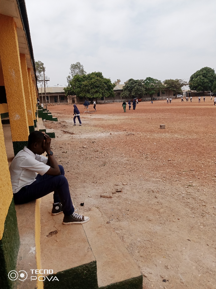 The scene depicts an outdoor environment in Kakuri Gwari, Nigeria, under an overcast sky. In the foreground, positioned on the left, a young male individual sits on concrete steps. He is attired in a white short-sleeved collared shirt, dark blue trousers, and dark high-top sneakers with white laces and toe caps. A dark wristwatch is visible on his left wrist. His head is bowed, and his hands are clasped and resting on his forehead. The steps are part of a building featuring yellow upper walls and dark green lower sections. Extending from the mid-ground to the background on the right is a large, reddish-brown, dusty dirt field. Scattered across this field are approximately fifteen individuals, some in groups, others singly. One person wearing a blue garment walks towards the left in the mid-ground. In the distant background, several green-leafed trees and various low-rise buildings, some with corrugated metal roofs, are visible. A tall, slender metal tower structure is present in the far left background. No distinct organized activity is observed among the individuals on the field.