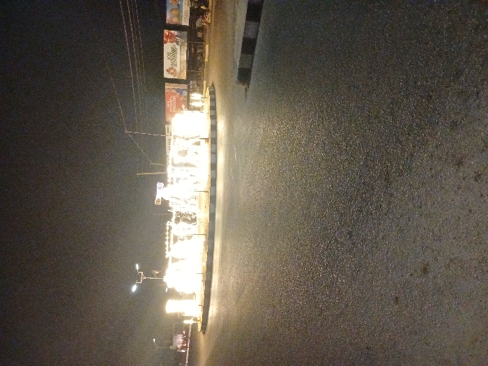 A dimly lit nighttime scene focuses on a wet, dark road surface. Beyond the road, vibrant lights illuminate buildings and signage. Power lines stretch above, adding to the urban aesthetic. The scene conveys a sense of quiet urban life at night, with the road reflecting the surrounding illumination.