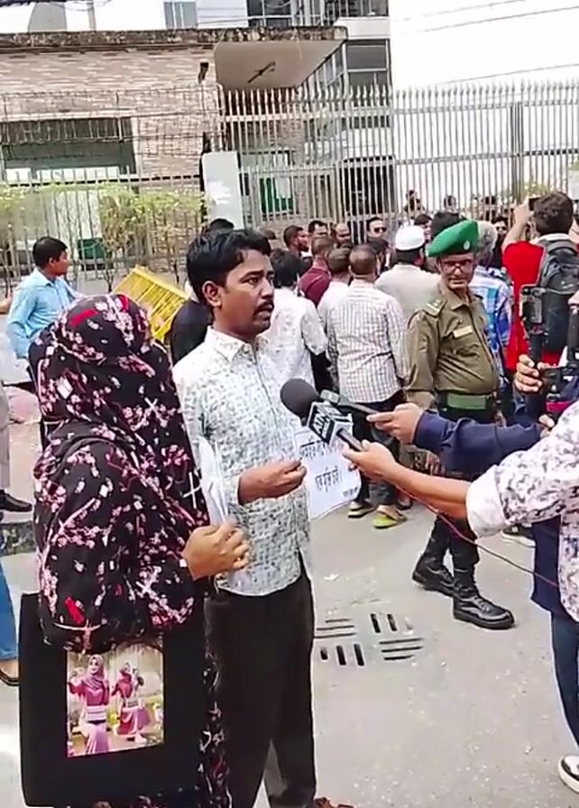 A group of people are gathered outside a building. A man in a patterned shirt and brown sandals is being interviewed by a reporter holding a microphone with the logo "DBC" on it. A woman in a floral hijab stands next to the man. She's holding a black tote bag with a photo of a group of women on it. Behind them, there's a crowd of people, some of whom are looking at the interview. A security guard in a green uniform stands among the crowd. A person in a red shirt is holding up their phone to record the interview. A building with a metal gate is visible in the background. There are power lines overhead.