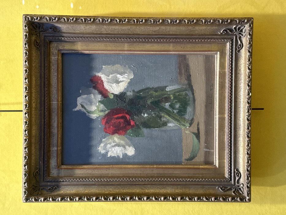 A framed still-life painting depicts red and white roses in a vase against a muted blue background