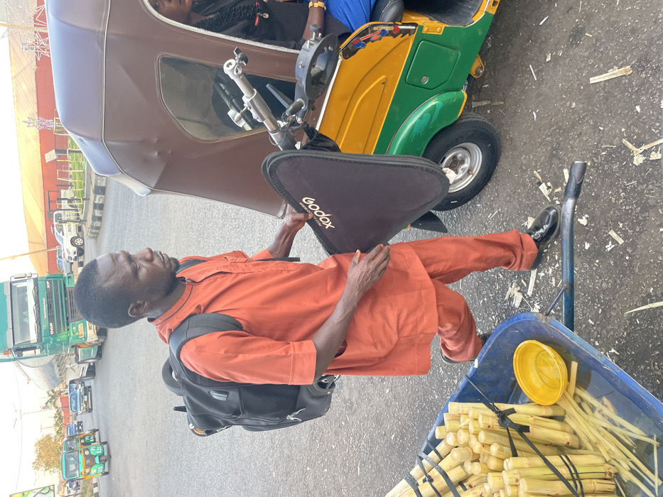 The image portrays an outdoor street scene in Jos, Nigeria, during daylight hours. In the immediate foreground, a dark-skinned adult male wearing an orange tunic and trousers walks from left to right. He has a black backpack on his shoulders and holds a black triangular Godox-branded photography reflector in his right hand. He is looking forward and slightly to his right. To his left, a blue plastic wheelbarrow is filled with numerous bundles of light-colored sugarcane stalks, with a yellow plastic bowl containing liquid positioned among them. The asphalt ground around the man and wheelbarrow shows scattered pieces of wood or sugarcane residue. To the man's right, a brown, yellow, and green three-wheeled motorized tricycle (keke napep) is partially visible, with a passenger's head and right shoulder discernible within its cabin. In the background, a multi-lane road carries vehicular traffic, including a large green DAF XF tanker truck, several cars, and another green and yellow keke napep. A roundabout with a concrete barrier and a white SUV are visible further down the road. Buildings and utility poles are present in the distant background under a clear sky.