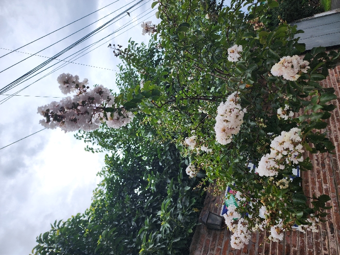 A low-angle shot captures a vibrant crape myrtle tree in full bloom. Clusters of white flowers contrast with the lush green foliage. The tree is positioned alongside a weathered brick wall. Above, power lines stretch across a cloudy sky, adding a touch of urban context to the natural scene. Darker green foliage from another tree is to the left.