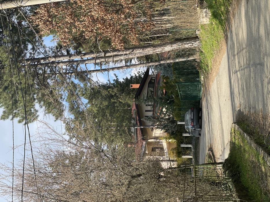 An outdoor scene in Starozagorski bani, Bulgaria, captures a paved residential road winding towards a multi-story house nestled among dense trees, viewed under a partially cloudy blue sky. The asphalt road, exhibiting visible wear and tire track shadows, occupies the lower portion of the frame. A concrete curb with sparse green vegetation and a rusted metal fence line the left edge of the road. On the right, a dark-colored Audi sedan, bearing Bulgarian license plate "CT 9761 AB", is parked facing away from the viewer. It sits in front of a dark green metal gate, part of a wire fence enclosing the property. The house, situated centrally, features light-colored walls (likely beige or cream) and a red-tiled roof with a prominent chimney. Its facade includes a rounded balcony and multiple windows. The environment is heavily forested: bare deciduous trees with utility wires overhead are prominent on the left, while tall evergreen pine trees and trees with dried brown leaves dominate the right side and background. No individuals are visible.
