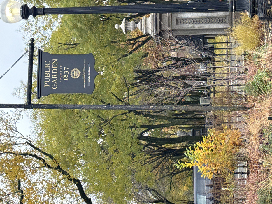A sign reading "Public Garden, Founded 1837" hangs from a black post