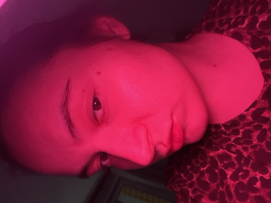 A close-up selfie of a person with fair skin, illuminated by a red light, tilting their head to the side