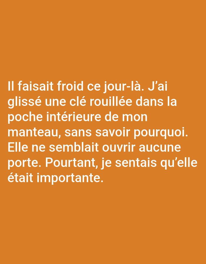 The image is a solid orange background with white text. The text reads: “It was cold that day. I slipped a rusty key into the inside pocket of my coat, without knowing why. It didn’t seem to open any door. Still, I felt it was important.” The coordinates provided place this location in Nanterre, France. The image itself is a close-up of the text. It appears to be a still image. No people or objects are present other than the text.