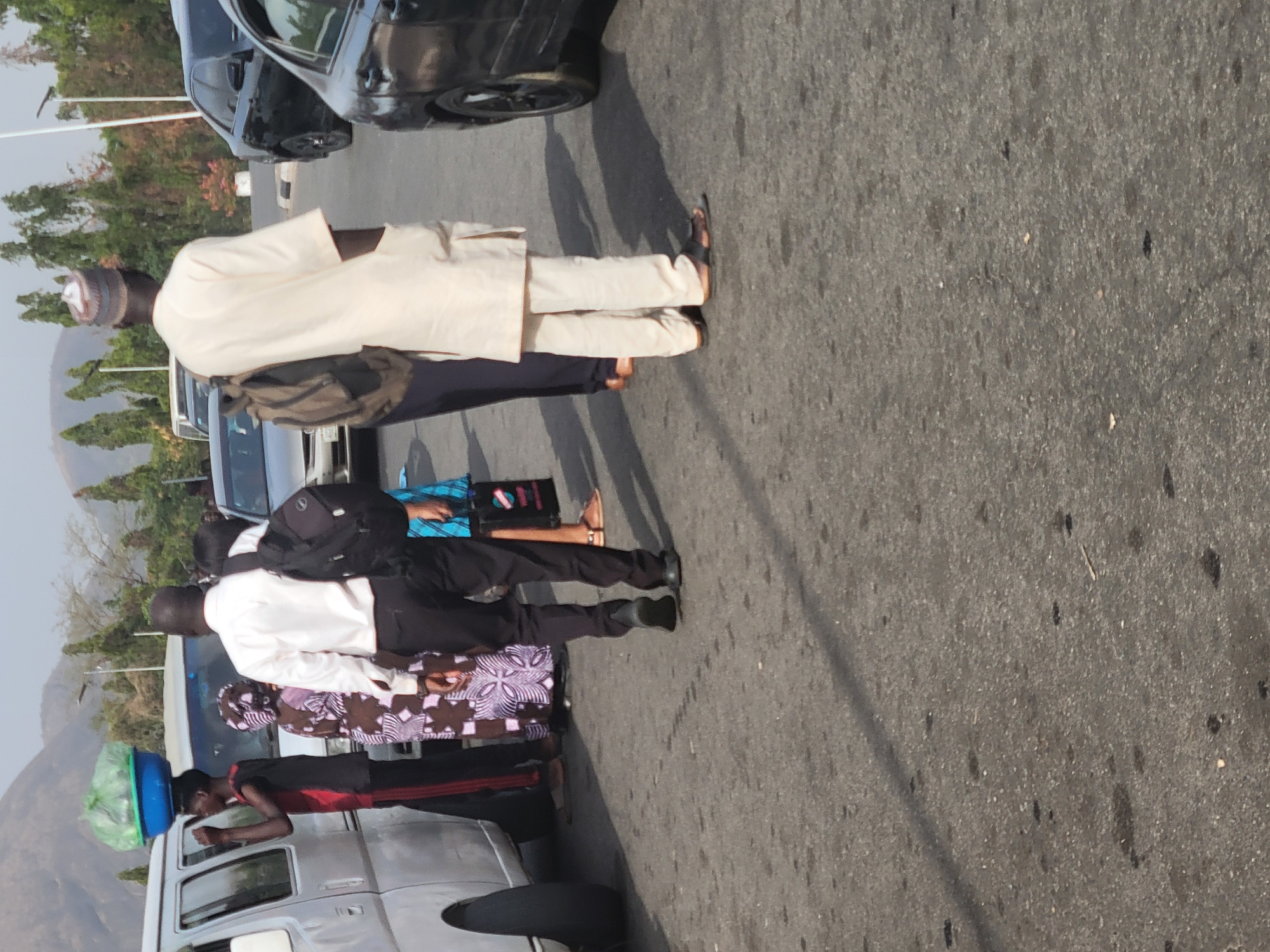 A group of pedestrians are standing on a road in Abuja, Nigeria. The pedestrians appear to be waiting for transportation. Some are dressed in traditional Nigerian clothing. There are several vehicles nearby, including a van, a car, and an SUV. The road is paved and there are trees and hills in the background.