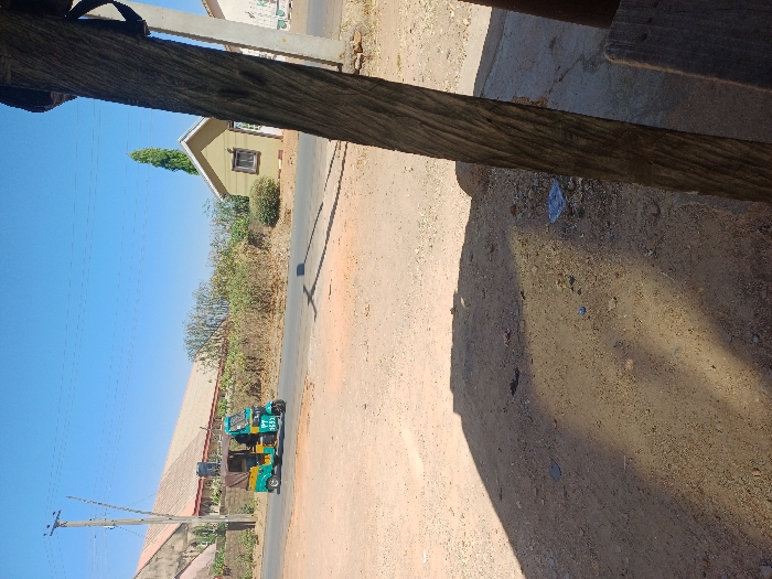 The scene depicts a sunlit outdoor environment in Unknown, Unknown. A paved, dark grey asphalt road runs horizontally across the midground. On the road, a green and yellow three-wheeled auto-rickshaw, bearing the license plate "PT 3692," is in motion from left to right, with a dark object mounted on its roof. A driver is partially visible inside the vehicle. To the left of the road, an electricity pole with wires extends vertically. Behind the road, dry, sparse vegetation and several buildings with reddish-brown sloped roofs are visible on the left side. On the right side of the road, a small, light olive-green building with a brown-framed window and a partially visible white door stands, with a tall, slender green tree positioned behind it. In the foreground, occupying the right side of the image, is a vertical, weathered wooden post with prominent diagonal grooves. A black strap is attached near its top. Below it, a flat, light-colored wooden surface is partially visible. The immediate foreground consists of reddish-brown compacted dirt, scattered with small stones and a crumpled blue plastic wrapper. Long, dark shadows are cast across the ground, originating from objects to the right, indicating bright, direct sunlight. The sky is clear, cloudless, and light blue.