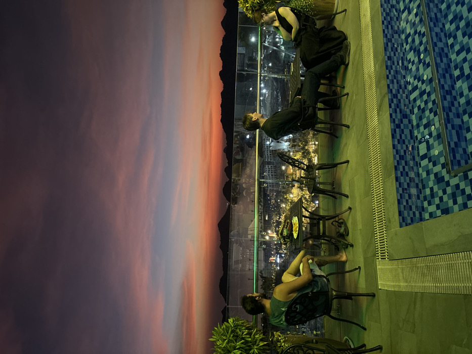 The scene depicts a rooftop observation deck or bar overlooking a city and distant hills during sunset or twilight in Hải Phòng, Vietnam. Three individuals are present, seated at outdoor tables. On the left, a male in a dark tank top and light-colored shorts is seated barefoot in a dark metal chair, facing away from the camera and looking towards the horizon. A small round metal table is positioned in front of him, holding a plate of yellow food items and an unidentified dark object. A pair of dark sandals rests on the floor beside the table. A large potted plant with green foliage is situated to his left. In the center-right, a male in a dark long-sleeved shirt and dark trousers is seated in a dark metal chair, facing right and gazing outward. To his immediate right, a female in a dark dress is seated in a similar chair, facing left and looking towards the male next to her. A small round metal table stands empty between these two individuals. A smaller potted plant is located to the female's right. The rooftop features a clear glass railing that separates the seating area from the expansive view of the city below. The urban area is illuminated by numerous streetlights and building lights, indicative of nighttime conditions. Beyond the cityscape, a range of dark, undulating hills or mountains forms a prominent silhouette against the sky. The sky displays a gradient of colors, transitioning from deep purple and blue overhead to vibrant pinks, oranges, and reds near the horizon, typical of a sunset. In the immediate foreground, a section of a swimming pool with blue and white checkered tiles is visible, bordered by a light-colored grated drain. The rooftop floor is covered with dark-toned tiles. Artificial light on the rooftop casts a greenish-yellow hue on the immediate surroundings.