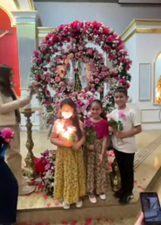 The video captures a group of three children posing for a photo in what appears to be a church. They stand on a raised platform decorated with scattered rose petals, in front of a large, elaborate floral arrangement of pink and red roses forming a circular backdrop. The children consist of two girls and a boy. The girl on the left wears a yellow floral dress and is holding a lit candle. The girl in the center has on a brown floral dress and a magenta top, while the boy on the right is dressed in a white t-shirt and black pants. All three children are holding single pink roses. Several adults are present. To the left of the children, a woman in a black tank dress stands holding a small bouquet. Another woman is standing beside her and taking photos with a phone. Behind them, an older woman in a polka dot shirt is visible. The interior of the church features a red wall with a crucifix on the left. To the right, there is a gilded statue in a niche. The architecture includes white pillars and a vaulted ceiling. The video is handheld and records the scene with ambient lighting.