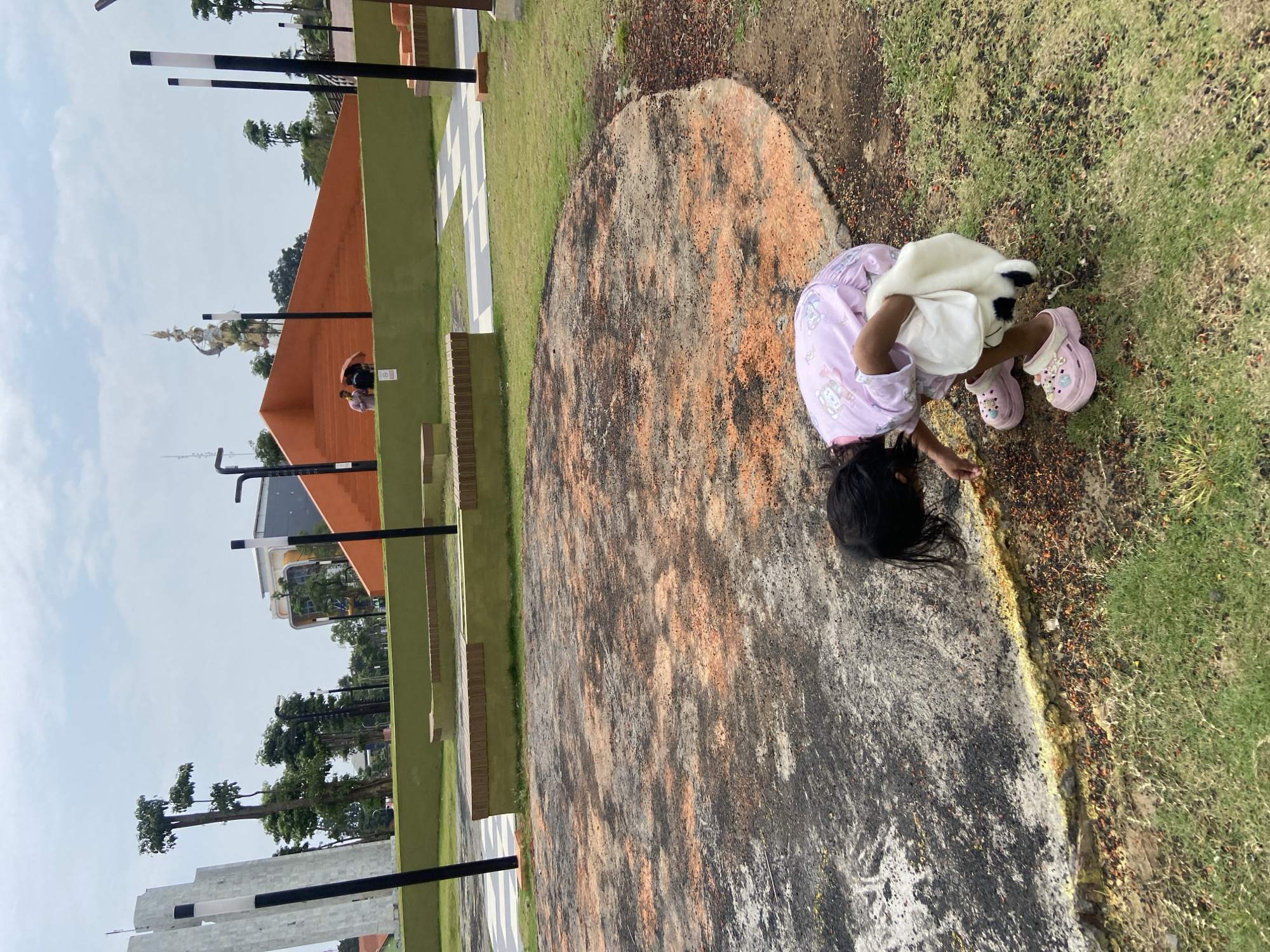 The image depicts a public park in Sidoarjo, Indonesia, under an overcast sky. In the foreground, a young child with dark hair, wearing a light purple dress with cartoon prints and pink clogs, is bent over at the waist. The child is actively observing and reaching towards a line of yellow granular material and dark specks accumulated along the edge of a circular, discolored concrete patch (exhibiting grey, black, and orange/brown tones) where it meets sparse grass and dirt. The child is holding a white, fluffy object, possibly a bag or stuffed animal, in their left arm. The midground features manicured green grass, low light-green retaining walls or benches with wooden tops, and a checkered grey and black paved pathway. Several black lampposts with white cylindrical lights are positioned throughout the park. In the background, distinctive structures are visible: a tall, white, abstract monument composed of multiple vertical slabs on the left; a prominent orange, angular structure with visible steps on the right, near which two adults are present—one standing, the other holding an open reddish-brown umbrella. A tall, golden, ornate statue is discernable further back, behind the orange structure. Various modern buildings and trees punctuate the horizon.