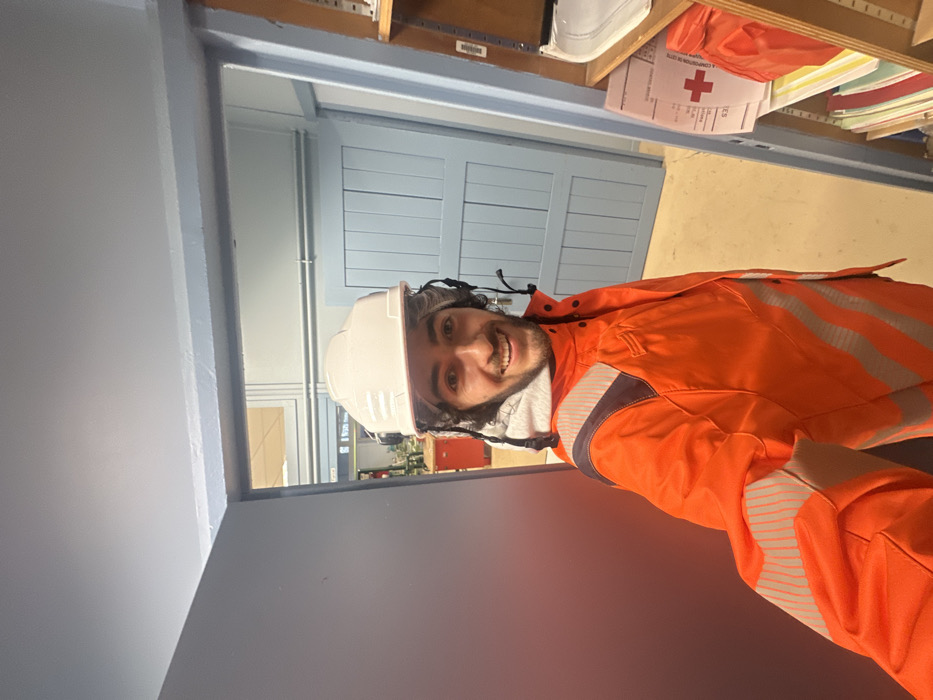The image depicts a male individual taking a selfie indoors within Saint-Étienne-de-Montluc, France. The man, possessing dark curly hair and a beard, smiles directly into the camera. He is attired in a white hard hat, a grey hooded sweatshirt, and an orange high-visibility jacket featuring grey reflective stripes. Black straps, consistent with hearing protection or a chin strap, extend beneath the hard hat. His right arm, holding the camera, is visible in the lower-left foreground. The background on the left reveals an open doorway leading into another interior space characterized by light blue-grey painted walls and a light-colored floor. A pale blue paneled door is situated within this background room, near a partial sign indicating "Wash room" with an arrow. On the right, a light blue shelving unit is filled with documents, folders, a white molded object, and a document displaying a red first aid cross.