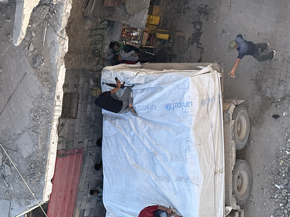 This image depicts a scene in Khan Yunis, Palestinian Territory, showing a truck laden with humanitarian aid in a damaged urban environment. The central subject is a large, multi-axle truck with its cargo covered by a light blue tarp prominently displaying multiple "unicef" logos. On top of this tarp, towards the right side of the truck bed, an individual wearing a dark shirt, grey pants, and a camouflage-patterned head covering is kneeling. This individual is actively handling an AK-style rifle. To the far left, partially visible on the truck, is another individual in a red shirt. In the immediate background, a concrete and brick building with significant structural damage is visible. Its upper section shows exposed rebar and concrete rubble, indicating partial destruction. A barred window is present in the brick wall. Below the window, on the brick wall, Arabic script graffiti is visible, and the lower portion of the wall has some red painted sections. To the right of the truck, situated against the building wall, a makeshift stall or market setup with various items, including yellow plastic containers, is present. Several children or young individuals are standing near this stall, observing the scene. Further back, behind the truck's cargo and against the building wall, several other individuals (likely men or youth) are partially visible, some wearing dark head coverings, appearing to be observing. In the foreground, on the ground to the bottom right of the truck, one man in a dark blue shirt and an olive green cap is standing with his arms outstretched, facing away from the viewer towards the truck, gesturing. The ground is a rough, unpaved surface with debris and dirt. The overall environment suggests a conflict-affected area under daylight conditions.