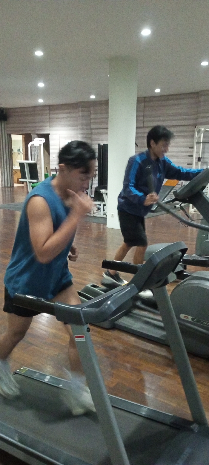 This image depicts an indoor gymnasium in Pacet, Indonesia. Two male individuals are engaged in physical exercise. In the foreground on the left, a man wearing a blue sleeveless shirt and black shorts is actively running on a treadmill, exhibiting motion blur on his lower legs and feet. His head is turned to his right, and his right hand is positioned near his chin. In the midground on the right, another man, wearing a dark blue long-sleeved jacket with light blue stripes and black shorts, is operating an elliptical machine or similar cardio equipment, holding its handles while looking forward with a slight smile. The gym features a polished wooden floor, a white ceiling with multiple recessed lights, and a light-colored structural column. The background shows additional, blurred gym equipment and a wall with horizontal wood paneling.
