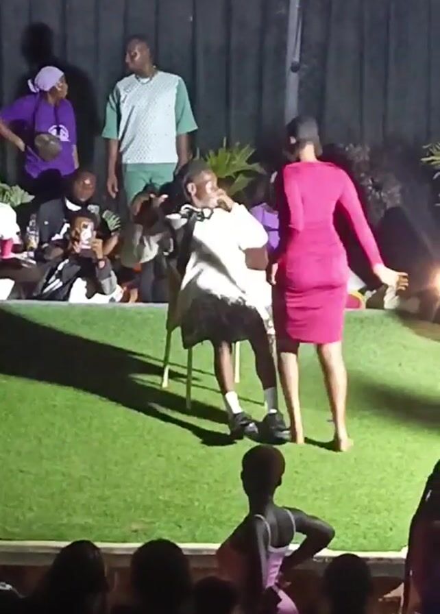 A man is sitting on a chair. A woman in a pink dress straddles his legs while facing away from him. There is a small crowd watching the scene. The scene takes place on a patch of artificial turf. There is a white chain-link fence in the background. Several people are sitting on the ground behind the actors. A spotlight is directed at the scene.