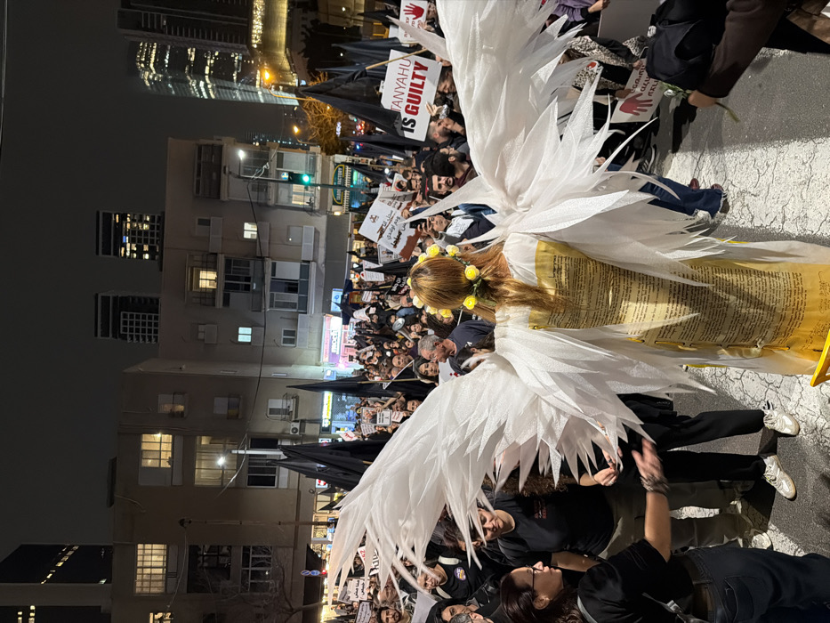 A person with white angel wings and a yellow flower crown participates in a protest at night. Many people hold signs and wave black flags. Some signs read "TANYAHU IS GUILTY". Buildings are visible in the background, with some windows illuminated. The protest takes place on a paved street.