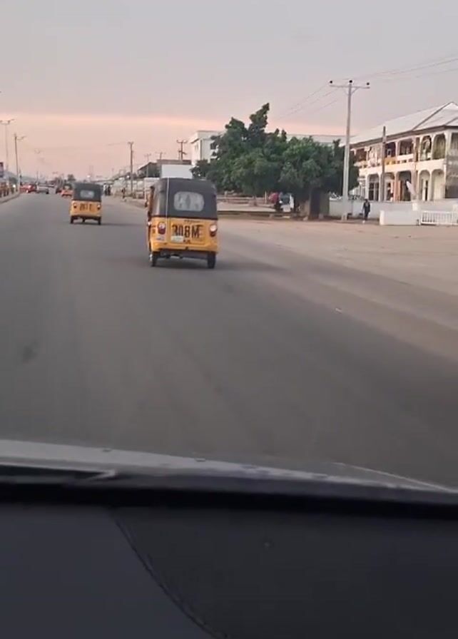 The view from inside a car traveling down a wide, multi-lane road captures a morning commute. The sky is a pale gradient, suggesting either dawn or dusk. The road is flanked by low-rise buildings, power lines, and the occasional tree. Three auto rickshaws, painted yellow with black hoods, are traveling ahead of the camera car. A motorcycle rides along the side of the road. The scene is typical of urban transportation in some parts of the world, with a mix of private and public vehicles sharing the roadway. The video is stable, providing a clear and steady perspective of the passing scenery.