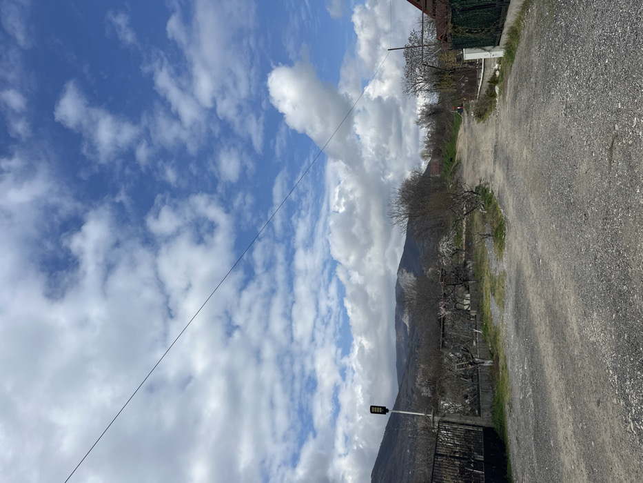 The image displays an unpopulated, semi-rural scene in Brestnik, Bulgaria, under a partly cloudy daytime sky. Numerous white cumulus clouds are scattered across a blue sky, which is bisected diagonally from the upper left to the lower right by a taut, dark overhead wire or cable. In the foreground, a wide, unpaved path of dirt and gravel extends into the midground, appearing to split or curve towards the right. Green vegetative patches are visible on the ground adjacent to the path. On the left side of the path, a black metal gate with decorative elements is partially visible. Further back, a tall pole supports a black, rectangular solar-powered street light fixture. Behind this, a low concrete structure borders an area containing multiple deciduous trees, primarily with bare branches, although some exhibit small white or pink blossoms. In the background on the left, a range of sparsely vegetated hills or mountains rises. On the right side of the path, a green metal fence, potentially overgrown with vegetation, defines a property line. Behind this fence, a section of a white wall is visible, and the corner of a building featuring a reddish-brown tiled roof is present in the upper right portion of the frame. Additional bare-branched trees are scattered along this side. The distant background consists of a continuous range of mountains under the cloud-filled sky. No individuals, animals, or active events are depicted.