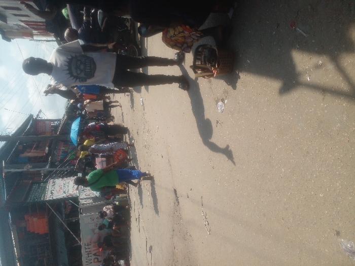 The image displays a bustling, sunny street scene in Satellite Town, Nigeria, characterized by significant pedestrian activity