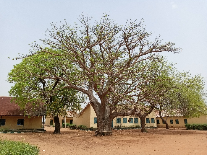 large, leafy tree in the center of a courtyard. There are several buildings surrounding the tree, all of which are made of light-colored brick and have windows with blue frames. The buildings have brown tiled roofs. The courtyard is covered in dirt, and there is some sparse vegetation growing near the base of the trees. The location is the Rumde Waziri area in Yola, Adamawa, Nigeria. The coordinates (latitude: 9.184, longitude: 12.521) correspond to a residential area in Rumde Waziri, and the image's context suggests it is near a school building. There are no people visible in the image. The scene is peaceful and quiet.