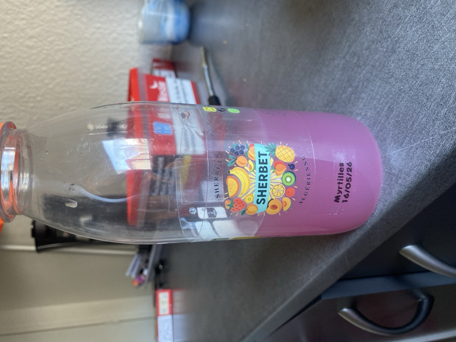 This image depicts a partially consumed transparent plastic bottle, containing approximately 350-400ml of a magenta-colored liquid, resting on a dark gray or black speckled countertop, likely in a kitchen or utility area within the city of Unknown, Unknown. The bottle features a colorful label with illustrations of various fruits, including strawberries, bananas, peaches, kiwis, pineapples, and berries, centered around the word "SHERBET" in a teal banner. Below this, the text "ALGERIENNE" is visible, followed by "Myrtilles" (Blueberries) and a date "16/05/26" stamped directly on the bottle, indicating the expiration or production date. The bottle has an orange plastic rim at its opening, though the cap is not visible. In the blurred background, several objects are discernible: to the left, part of a dark cabinet with two silver handles. Behind the bottle, various items are stacked, including red containers, one of which appears to be a "WESTERN" brand cigarette pack with a blue logo, and another possibly a "Marlboro" pack. A silver straw or stirring utensil lies horizontally on the counter behind the bottle. Further to the right, a light blue and white mug or cup is partially visible. The background wall is a light, neutral color, possibly beige or off-white. There are no people present in the scene, and no visible actions or interactions are occurring. The lighting suggests ambient indoor illumination, possibly with a window nearby causing reflections on the bottle.