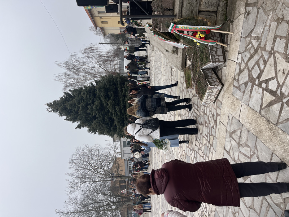 The image depicts an outdoor public square in Dve Mogili, Bulgaria, under an overcast sky. The ground is paved with irregularly shaped light-colored flagstones. In the mid-ground, a large, dark green evergreen tree stands prominently, flanked by bare deciduous trees. In the background, various buildings are visible, including a light brown structure to the left and a lighter-colored building to the right, adjacent to which a black speaker and equipment are set up on a raised platform. Numerous people are gathered across the square, appearing to be adults and young adults, mostly dressed in winter coats and jackets. In the immediate foreground, with her back to the camera, a person wears a dark red hooded puffer jacket and black pants. To the right of the foreground, two mosaic-tiled planters, shaped like a cross, contain sparse green vegetation. Leaning against or near these planters are several large commemorative wreaths, one clearly displaying ribbons in the colors of the Bulgarian flag (white, green, red) and artificial flowers. In the mid-ground, a small cluster of individuals includes a woman in a light blue long coat holding a bouquet of white flowers, facing right while seemingly conversing. Adjacent to her, another woman in a white puffer jacket and black backpack faces away from the camera, and a third woman in a striped cardigan stands facing them. The overall scene suggests a public gathering or commemorative event.