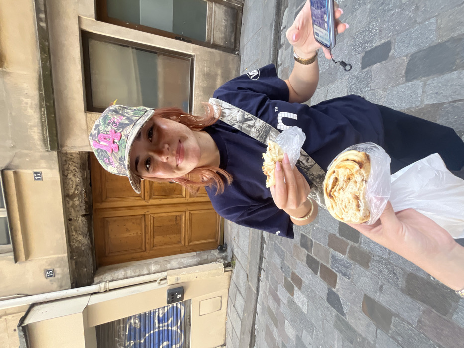 young woman standing on a cobblestone street in Paris, France. She is positioned centrally, smiling directly at the camera. She has reddish-brown hair and wears a camouflage baseball cap with a pink "LA" logo, a navy blue t-shirt with a white "Vans" logo, black leggings, and a camouflage crossbody bag. Her right hand holds a partially consumed, swirled pastry wrapped in clear plastic. Her left hand grasps a dark mobile phone, which dangles from a black lanyard, its screen illuminated. A gold-toned bracelet is visible on her right wrist, and her fingernails are painted light pink. In the immediate foreground, a hand, presumably belonging to the person taking the photo, holds an identical, partially consumed swirled pastry in clear plastic packaging. This hand also exhibits light pink nail polish and a gold-toned watch. The background features a worn, light-colored stone building with two prominent wooden double doors. Above these doors, the building numbers "15" and "17" are visible. To the far left, a light-colored downspout runs vertically along a building section with a partially raised blue-graffitied metal security shutter. To the right of the woman, a dark, angled window or doorway is visible. The ground consists of varied grey cobblestones.