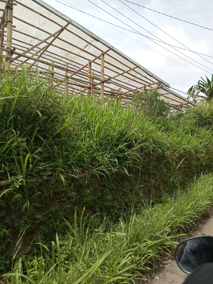 The scene is located in Namthoung, Laos. The lower right foreground shows a partial black vehicle side mirror, situated beside a dark gray road surface. To the left and extending into the midground, a steep embankment is densely covered with various types of green vegetation, primarily tall grasses and some broadleaf plants, concealing much of what appears to be a stone or concrete retaining wall. In the background, a large, open-sided structure is visible, constructed from a framework of natural bamboo poles. A translucent white sheet or fabric forms a canopy over this bamboo structure. To the right of the structure, additional green foliage, including larger broadleaf plants, is present. The sky above is light gray with scattered clouds, traversed by multiple thin, dark utility lines. No individuals or active subjects are visible.