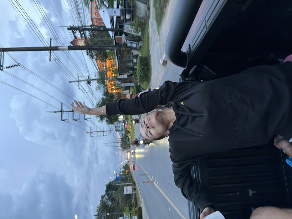 A female subject is depicted in the bed of a black pickup truck, moving along a multi-lane road in Si Sunthon, Thailand, at dusk or early evening