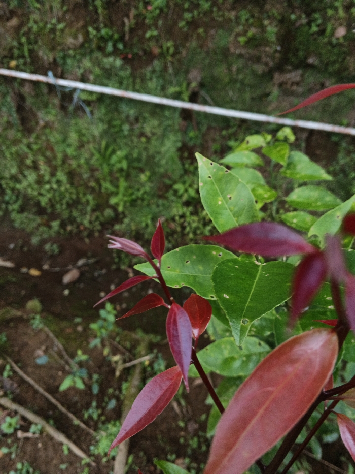A high-angle, close-up photograph captures plant life in an outdoor, natural environment located in the city of Unknown, Vietnam. The foreground is dominated by a plant stem bearing vibrant reddish-brown leaves, appearing as new growth, alongside mature green leaves. Several green leaves exhibit minor perforations, consistent with insect damage. The background is blurred, revealing an expanse of dense green ground vegetation. A dark, possibly muddy ground strip is visible in the lower-mid background, below a horizontally oriented, light-colored pipe or bar that extends across the scene. No human subjects, explicit actions, or direct interactions are depicted.