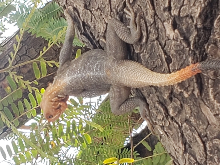 - "A male agama lizard, exhibiting an orange-red head, a greyish body with scattered white speckles, and a tail transitioning from light orange-brown to dark grey-black, is observed clinging vertically to the deeply furrowed brown bark of a tree trunk in Adankolo, Nigeria" by FM-Da03f1, licensed under CC BY 4.0
