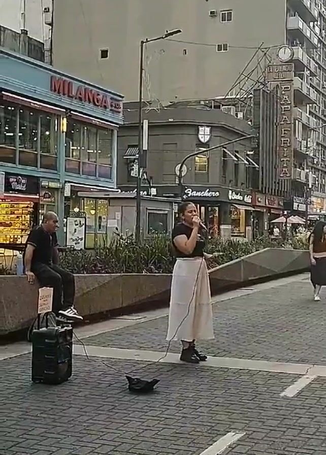 A woman stands on a brick street in front of a speaker with a microphone, singing. A man sits on the speaker. Both are on an island in a street; one person walks by on the right. Buildings and businesses are in the background. The sky is overcast.