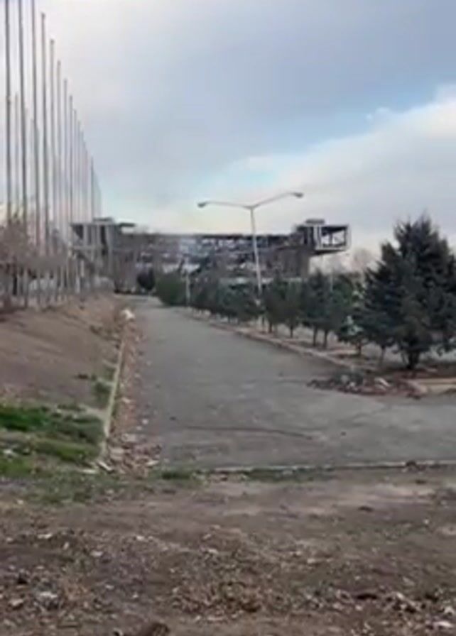 aftermath of a fire. A charred and skeletal structure of a building is visible in the background. Smoke rises from the remains. A row of tall, thin poles stand on the left side of the frame. A paved path runs towards the building, lined with small trees. Debris and litter are scattered around the ground. The sky is overcast.