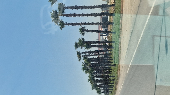 The image depicts a static outdoor scene in Ain Chkef, Morocco, under a clear, bright blue sky. In the foreground, an asphalt road with a continuous white line along its right edge is visible, partially obscured by reflections on a glass surface, likely a vehicle window. To the right of the road, a curb delineates a strip of light brown ground transitioning into green grass. The midground features a long, slightly undulating row of approximately twenty tall palm trees with slender, dark, textured trunks and green fronds at their crowns. These trees extend from the left foreground towards the right background. In the background, visible between and behind the palm trees, is a gas station or service area, identified by a distinctive red and white canopy. Additional low-rise, light-colored buildings are discernible further in the distance beyond the gas station structure. No individuals, discernible actions, or interactions are present in the scene.