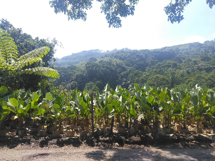 The image displays a rural landscape in Noria de Luis, Mexico, under bright daylight. A dirt or gravel path occupies the foreground, extending horizontally across the lower portion of the frame, with visible shadows. Immediately behind the path, a dense, organized row of numerous potted plants, each featuring broad, ovate green leaves, stretches across the midground. These plants appear to be young saplings or ornamental foliage, contained in individual containers or burlap-wrapped root balls resting on the soil. Beyond this cultivated row, the background consists of extensive, natural forest vegetation, including a large fern visible on the left side, ascending towards a prominent, tree-covered hill or mountain range that dominates the horizon. The sky above is bright and clear or hazy. Dark green foliage from an unseen overhead tree partially frames the top edge of the image. No individuals, vehicles, or man-made structures are visible.
