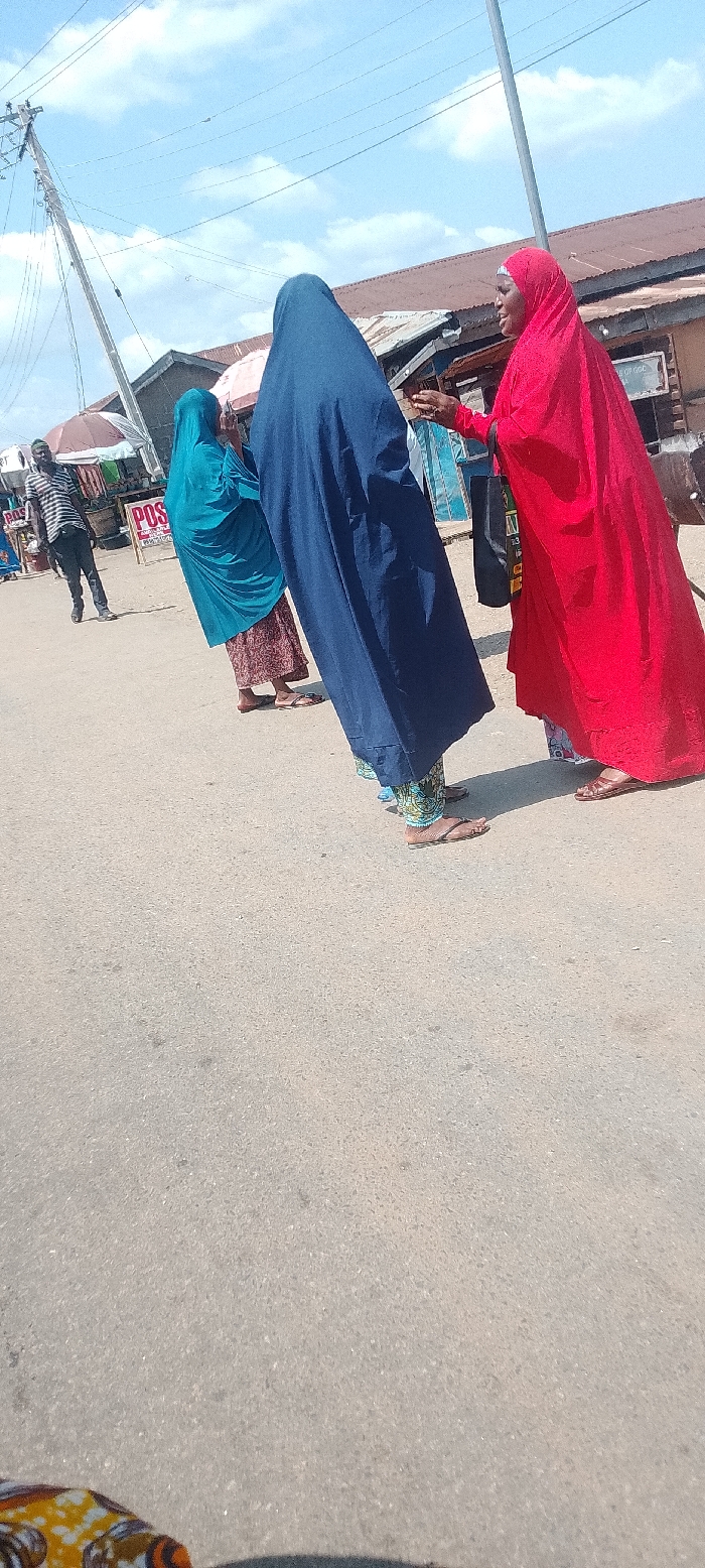 The image depicts a daytime street scene in Adankolo, Nigeria. In the foreground, three individuals are present. A woman in a dark blue abaya-style garment with patterned trousers and flip-flops stands with her back to the camera, positioned centrally. To her left, a woman in a teal-colored head covering and patterned skirt, wearing sandals, faces partially away, holding a mobile phone. To the right, a woman in a vibrant red hijab and long garment, wearing brown sandals, faces towards the right, extending her right arm and hand towards the central figure. She carries a black bag on her left shoulder. The ground consists of a light gray asphalt road surface, extending into the midground. In the left midground, a man wearing a horizontally striped shirt and dark trousers walks away from the camera, his back mostly visible. Behind him, a "POS" sign is visible, along with a striped umbrella and market-like structures. The background features various single-story buildings with rust-colored corrugated metal roofs, indicative of commercial or residential structures. A light-colored building further back displays text partially legible as "OF GOD." A prominent wooden utility pole with multiple overhead wires leans slightly to the left in the background, extending against a bright blue sky with scattered white clouds. The overall lighting suggests a sunny day.