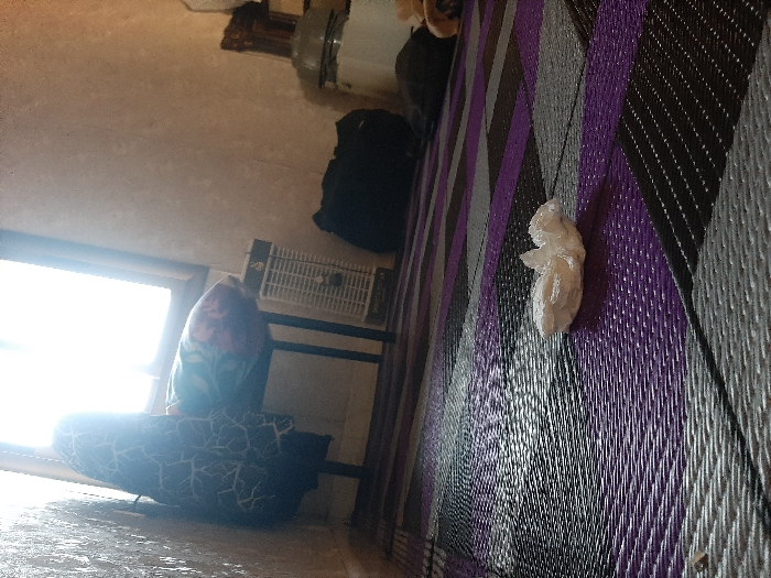 The image depicts an interior room located in Barza Municipality, Syria, captured from a low angle. The floor is covered by a woven mat featuring alternating stripes of purple, black, and gray. Centrally positioned in the foreground on this mat is a crumpled, translucent white object, possibly a piece of plastic or paper. No people are visible in the scene. Against the left wall, a dark-framed chair or stool holds a dark fabric with a white, web-like pattern draped over its back, and a floral-patterned pillow rests on its seat. To the right of the chair, an upright white electric fan or heater with a dark top panel stands on the mat. Further right, a dark bag rests on the mat. Against the far right wall, a large, clear glass container with a dark brown top and a white base is partially visible, next to some indeterminate light-colored fabric items. The left wall has a rough, textured, light-colored surface. The right wall appears smoother and light-colored. In the background, a brightly illuminated window with a dark frame serves as the primary light source, casting a significant portion of the room into comparative shadow. The overall environment suggests a domestic setting.