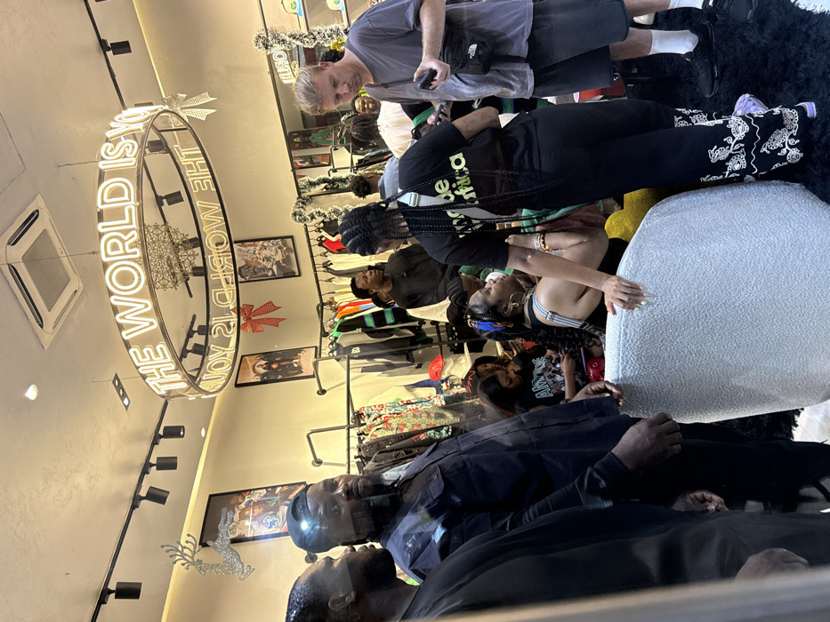 A group of people are indoors, possibly in a store, beneath a large, circular, illuminated sign reading "The World is Yours"