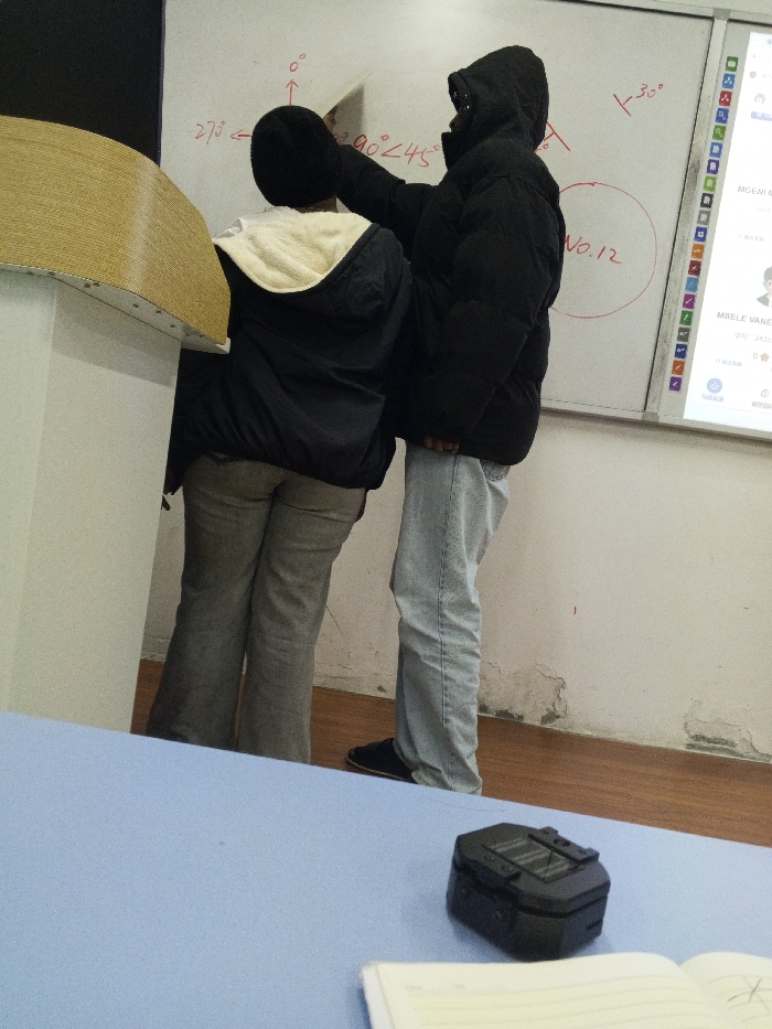 Two individuals stand by a whiteboard. The whiteboard displays text and diagrams, including angle measurements and the number "12" in a circle. One person wears a black hooded puffer jacket and light blue jeans. The other person wears a dark jacket with a light-colored hood, dark pants, and a black beanie. A desk with a notebook and a black device is visible in the foreground. A lectern is situated to the left.