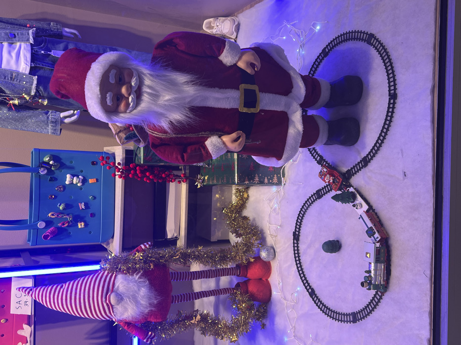 A Santa Claus figure stands near an elongated figure-eight-shaped train track with a toy train on it. A gnome doll with striped legs is adorned with gold tinsel. Presents and a tote bag with decorative magnets are near the gnome. The scene is lit with blue and white string lights.