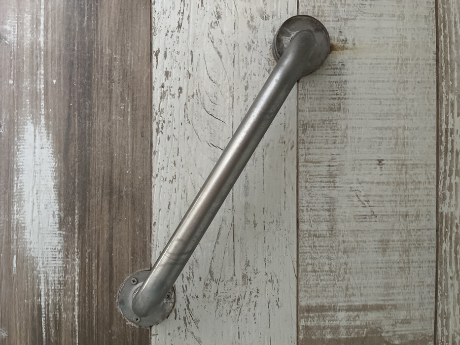 - "A silver grab bar is mounted on a wall featuring a wood panel design" by FM-Q8BoT2, licensed under CC BY 4.0